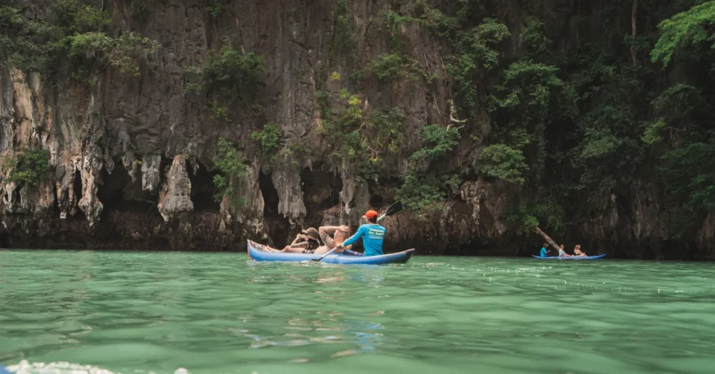 A highlight of any Phang Nga Bay tour is kayaking through sea caves, known locally as hongs. Guided by expert paddlers, you slip quietly through narrow tunnels that open into hidden lagoons surrounded by sheer limestone walls and lush mangroves. The water here glows in shades of jade and turquoise, and the sounds of nature — birds calling, water lapping softly against rock — create a sense of pure tranquility.