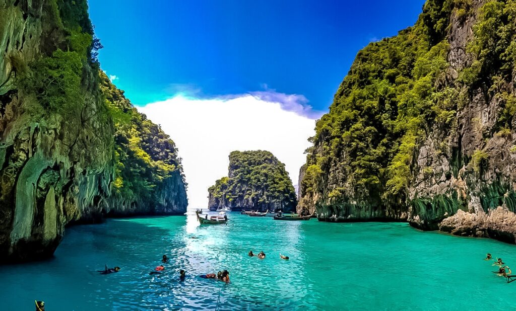 The Phi Phi Islands are world-famous, and for good reason. Towering limestone cliffs surround crystal-clear bays, creating dramatic landscapes that feel almost unreal. Maya Bay, once hidden from the world and now carefully managed, is known for its luminous turquoise water and soft white sand. Even viewing it from the boat is an awe-inspiring moment for many travelers.